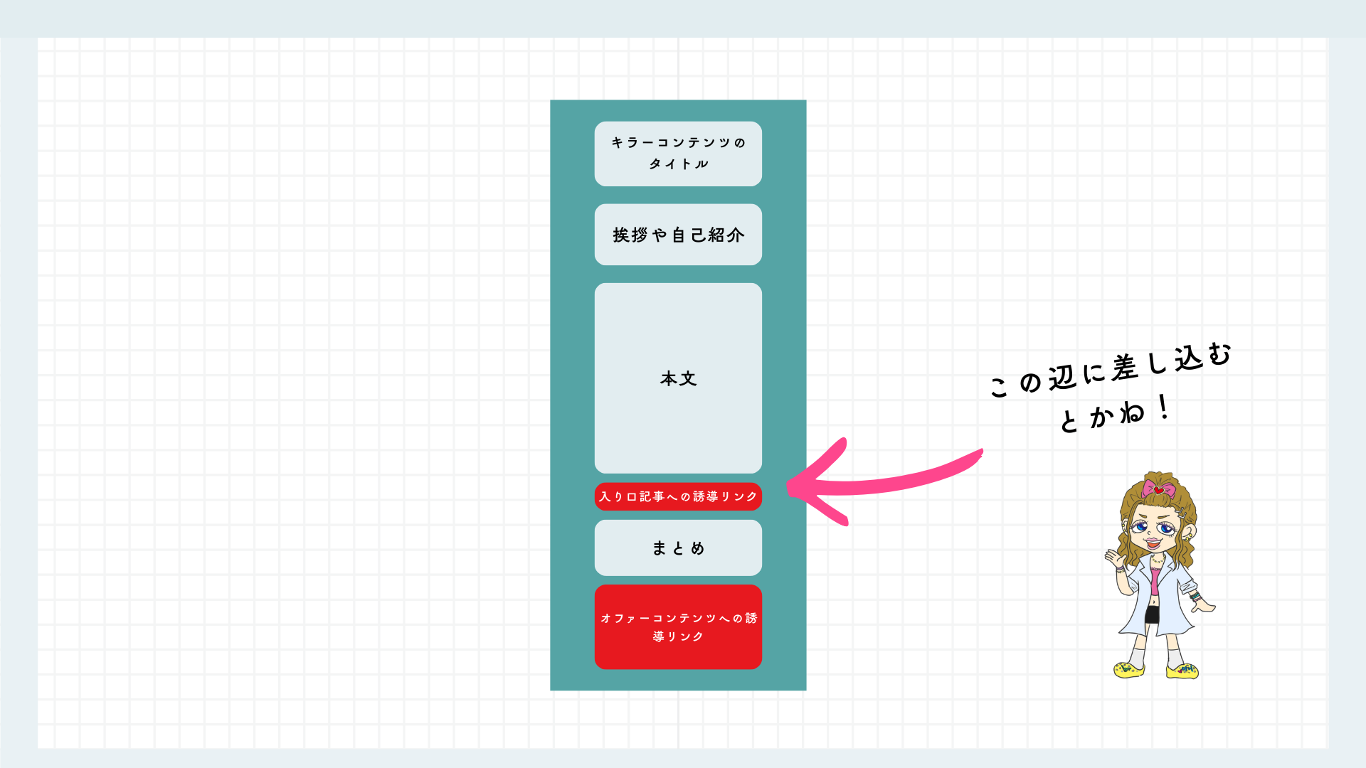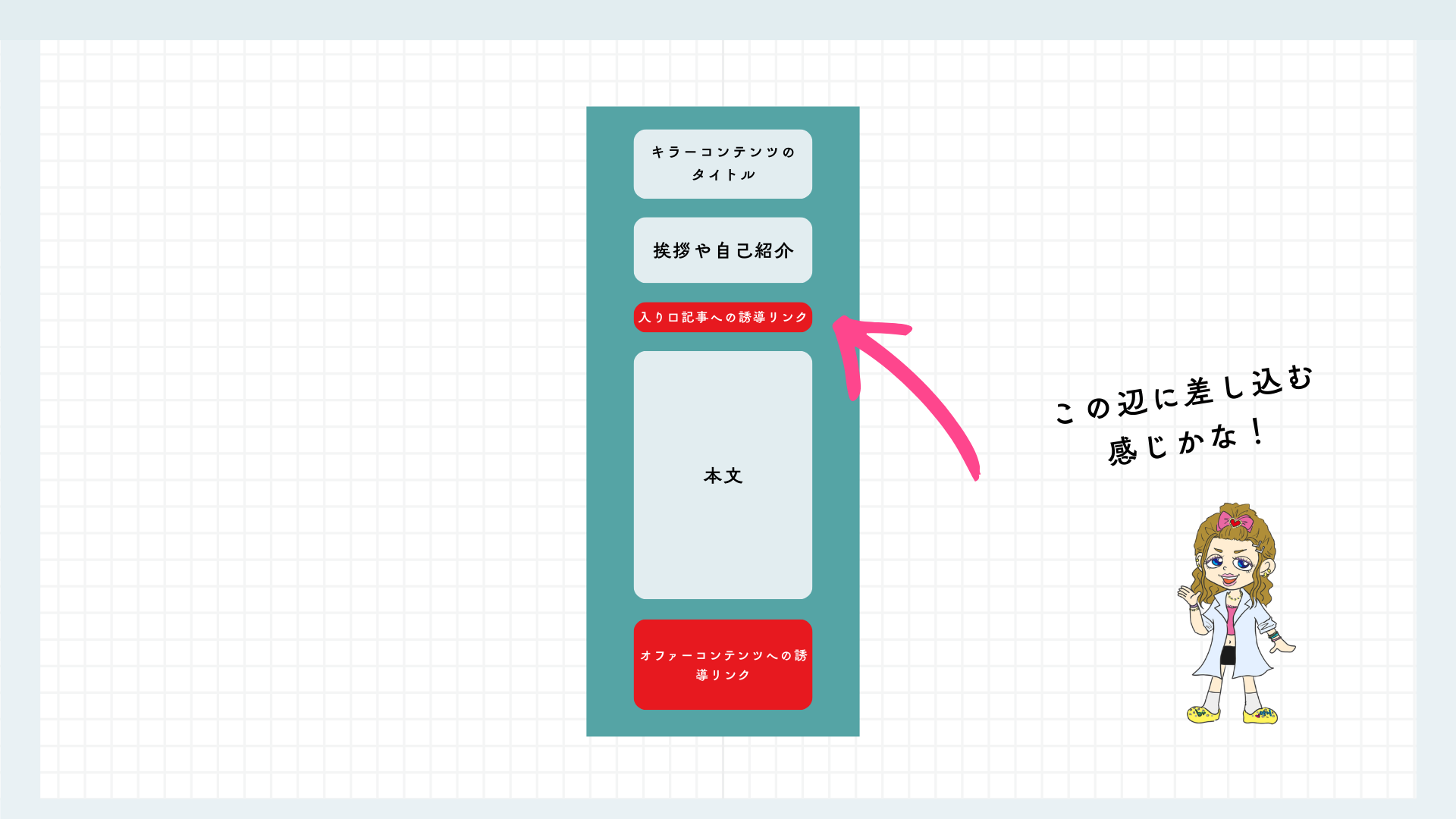 本文→入り口記事への誘導→まとめ→無料オファーLPへの誘導