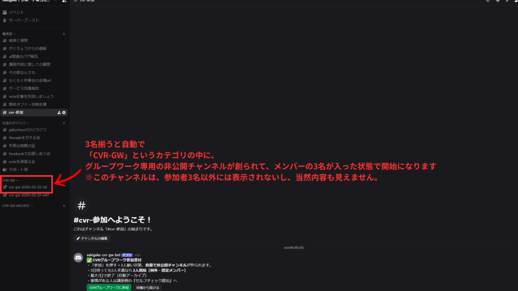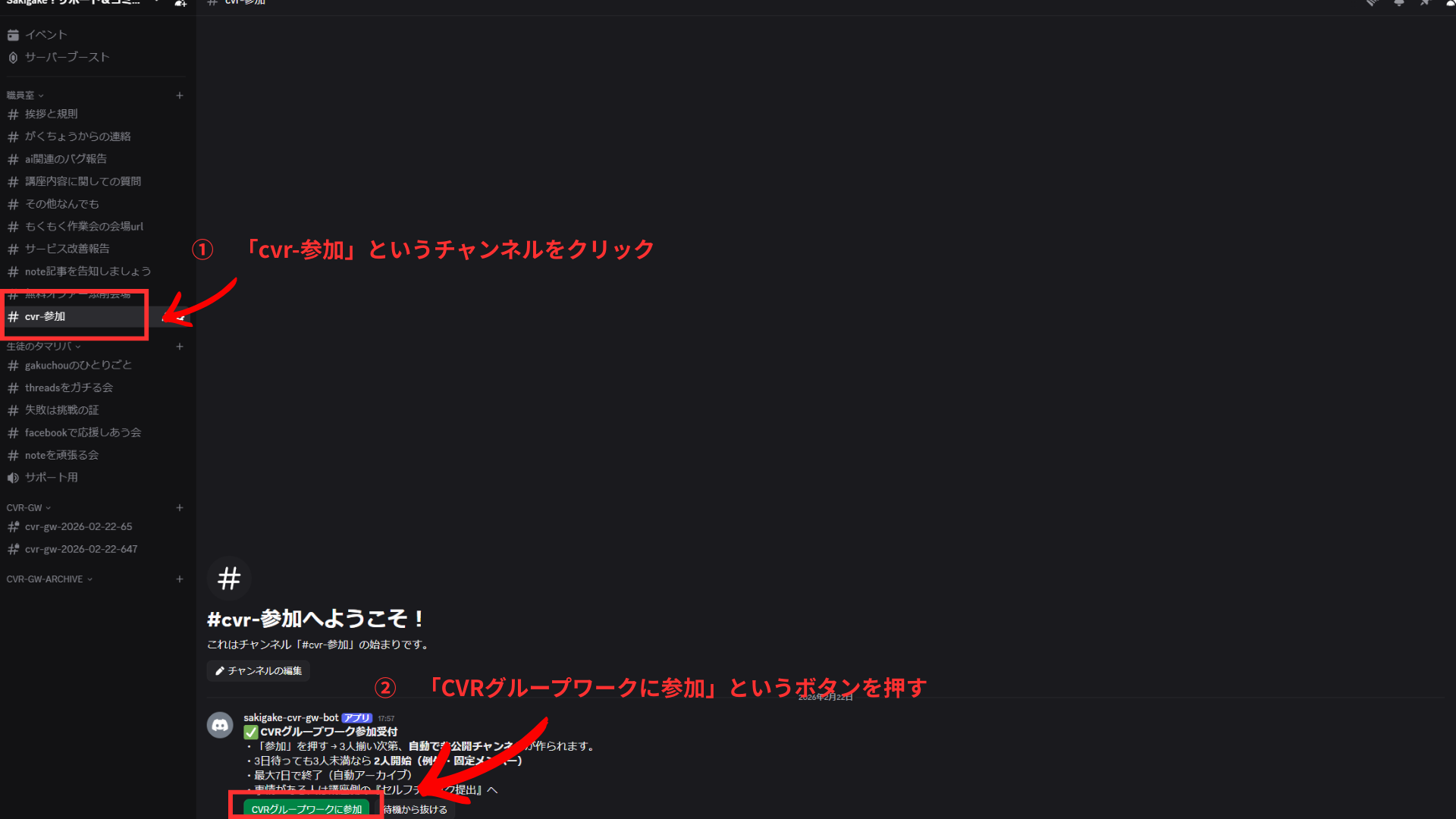 ①Discordの左側にある「チャンネル」の一覧から、「#cvr-参加」という名前のチャンネルを開きます。